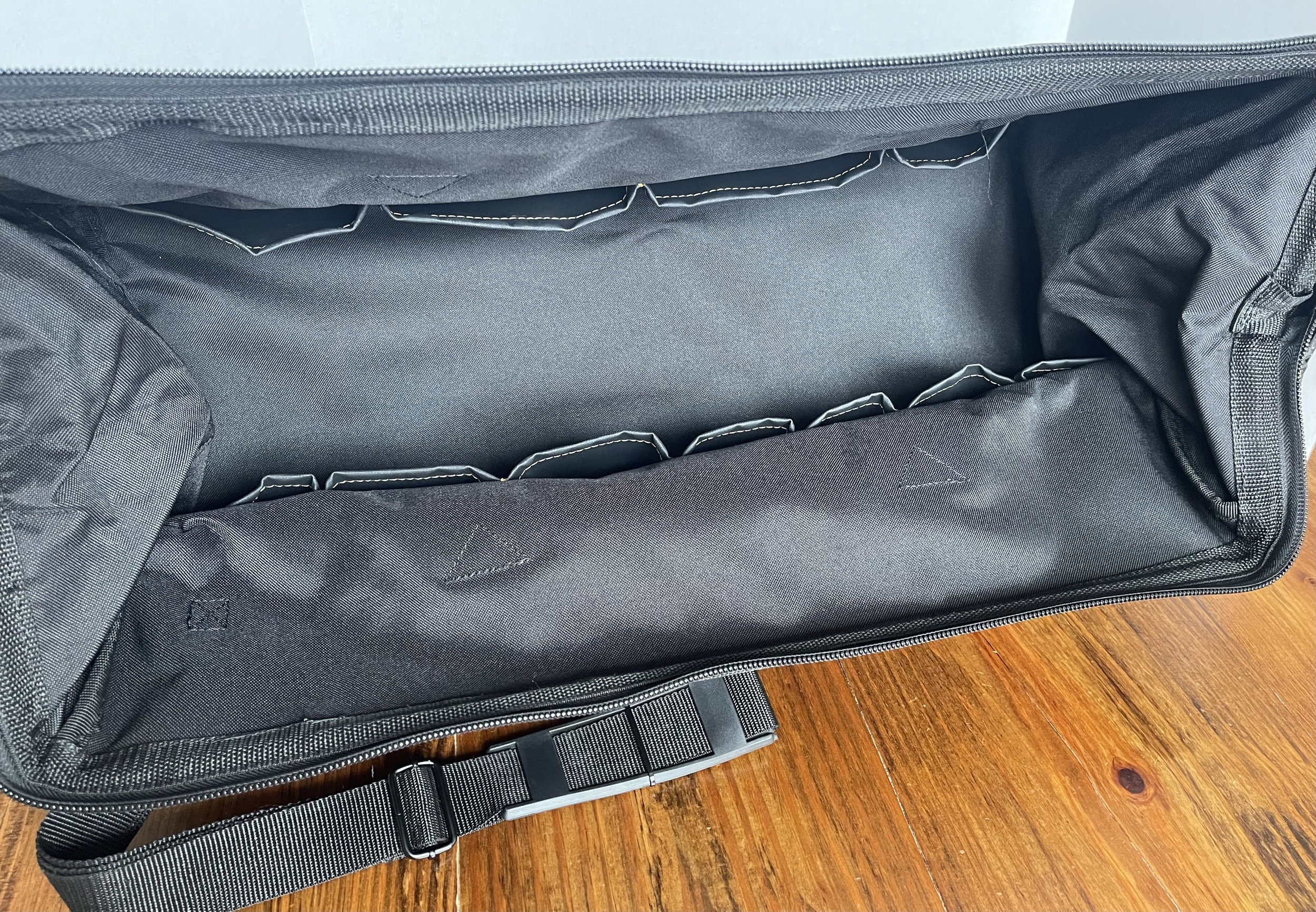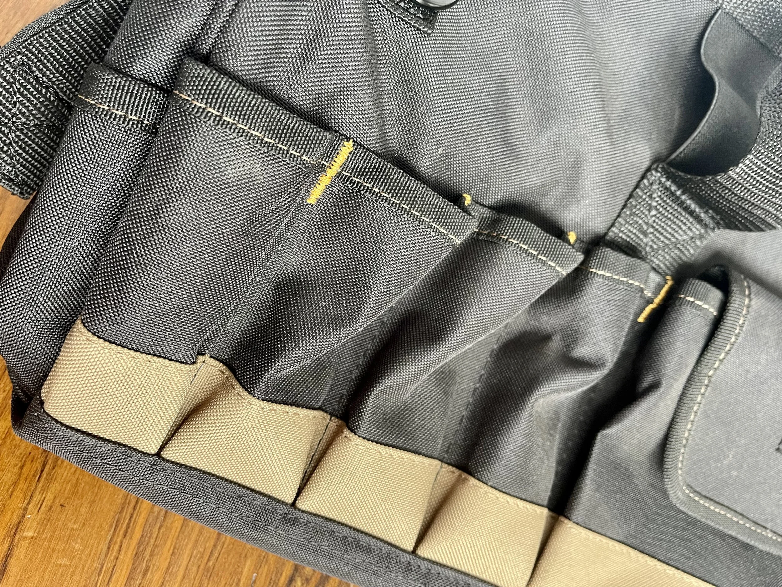 From the manufacturer: Our superior quality MegaMouth™ tool bag has 32 pockets and an extra-large interior compartment for tools and parts, plus padded handles and an adjustable shoulder strap for easy carrying.